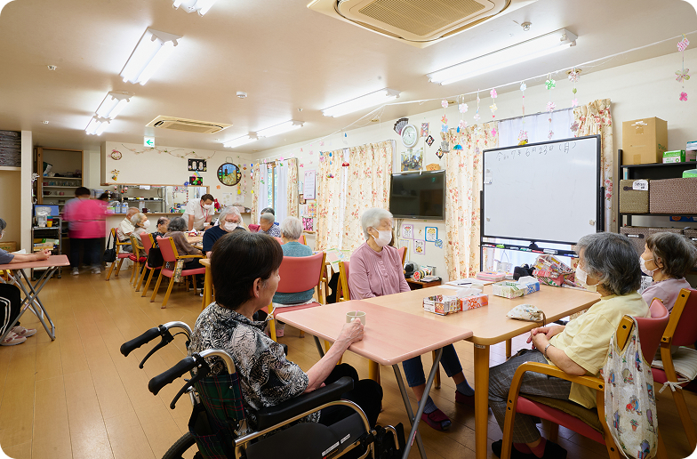 1日の定員は15名。ご利用者の体調やご家族のご予定に合わせて、時間の短縮・延長に対応できます。訪問サービスとは